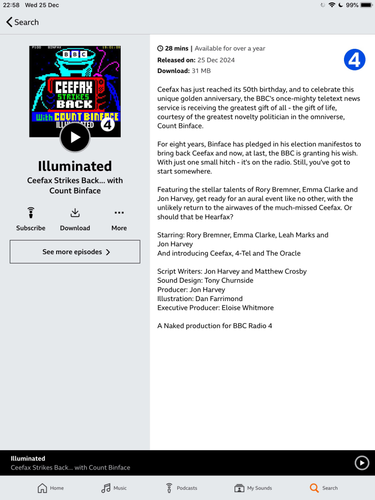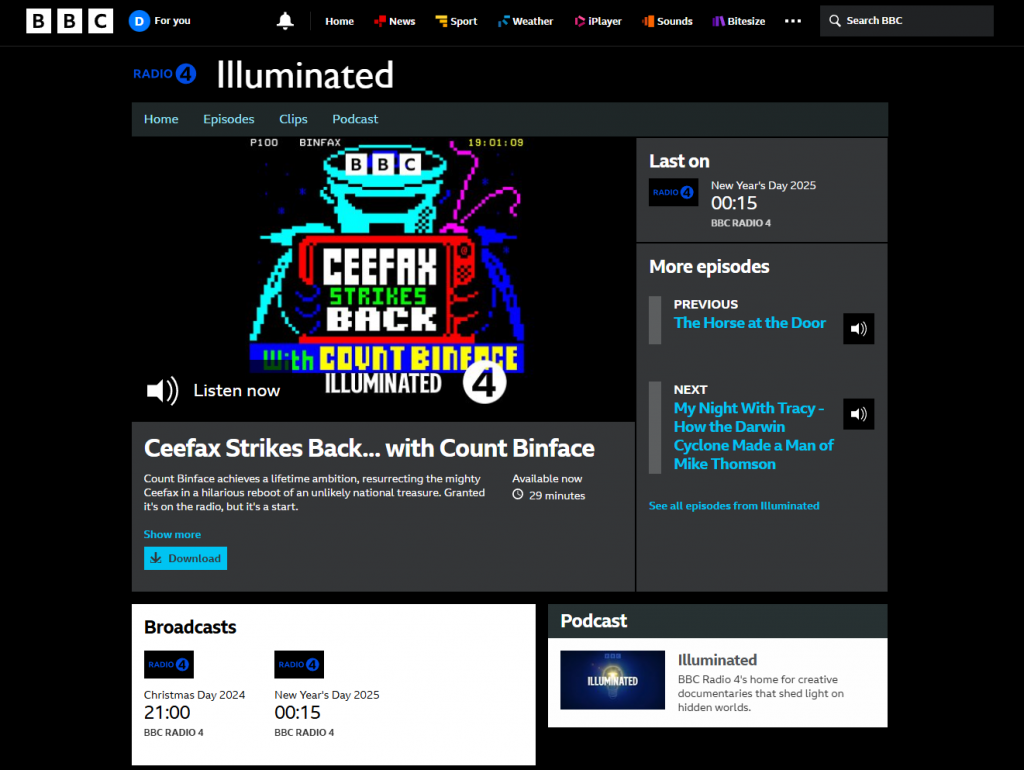 Thumbnail for Count Binface‘s Radio 4 documentary Illuminated: Ceefax Strikes Back, broadcast Christmas Day 2024.