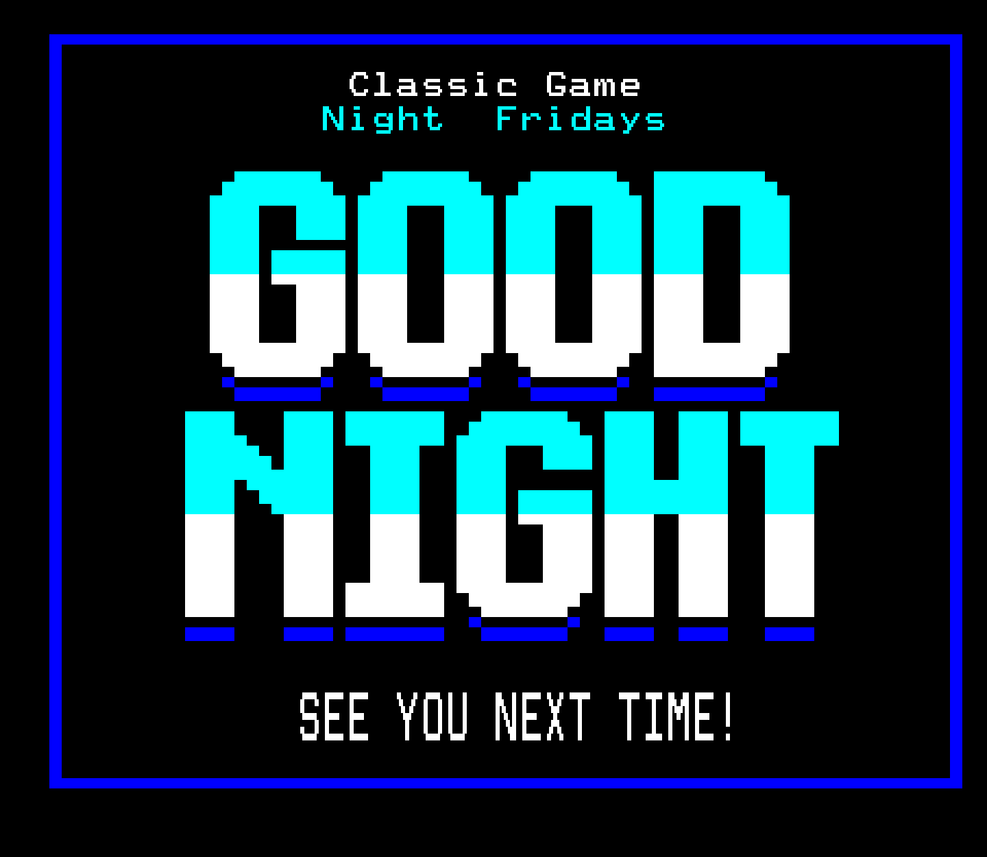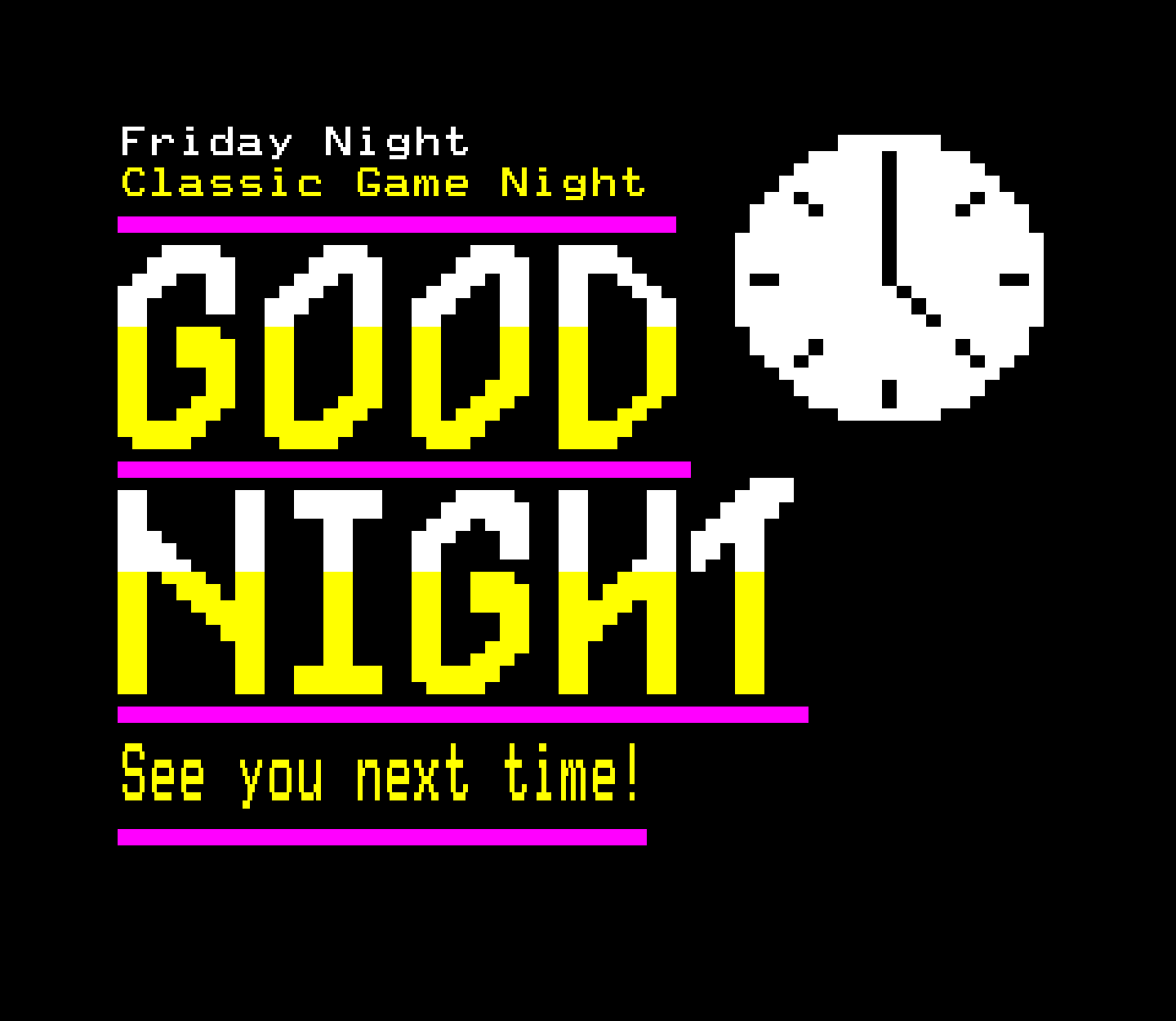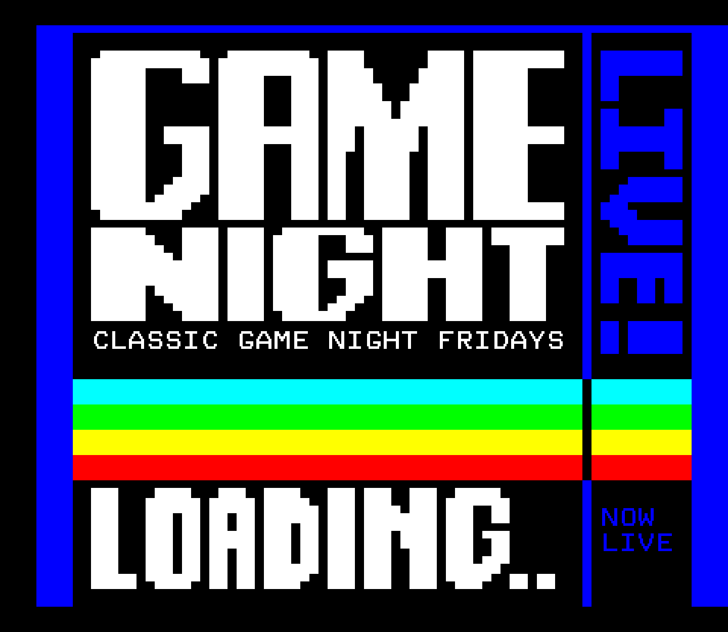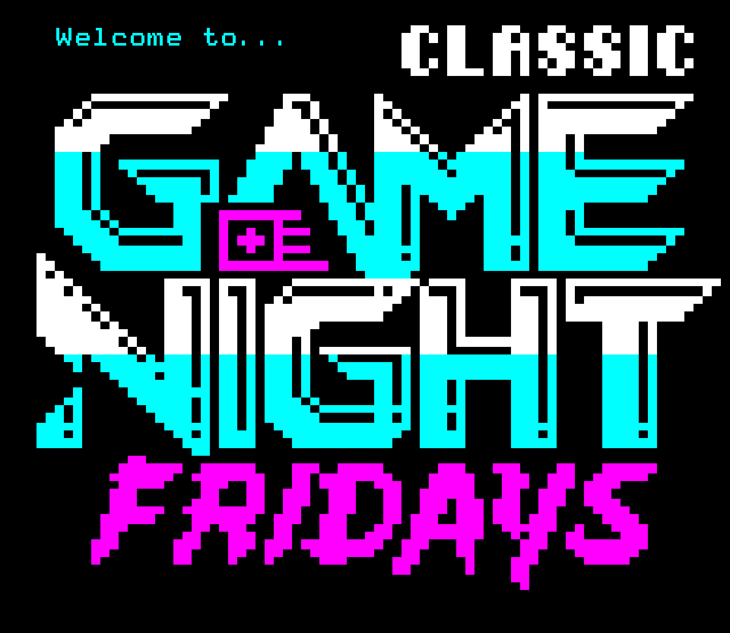 A variety of graphics for the Classic Game Night Live show, formerly Classic Game Night Fridays – mostly teletext with a few NES title screens thrown in for good measure.