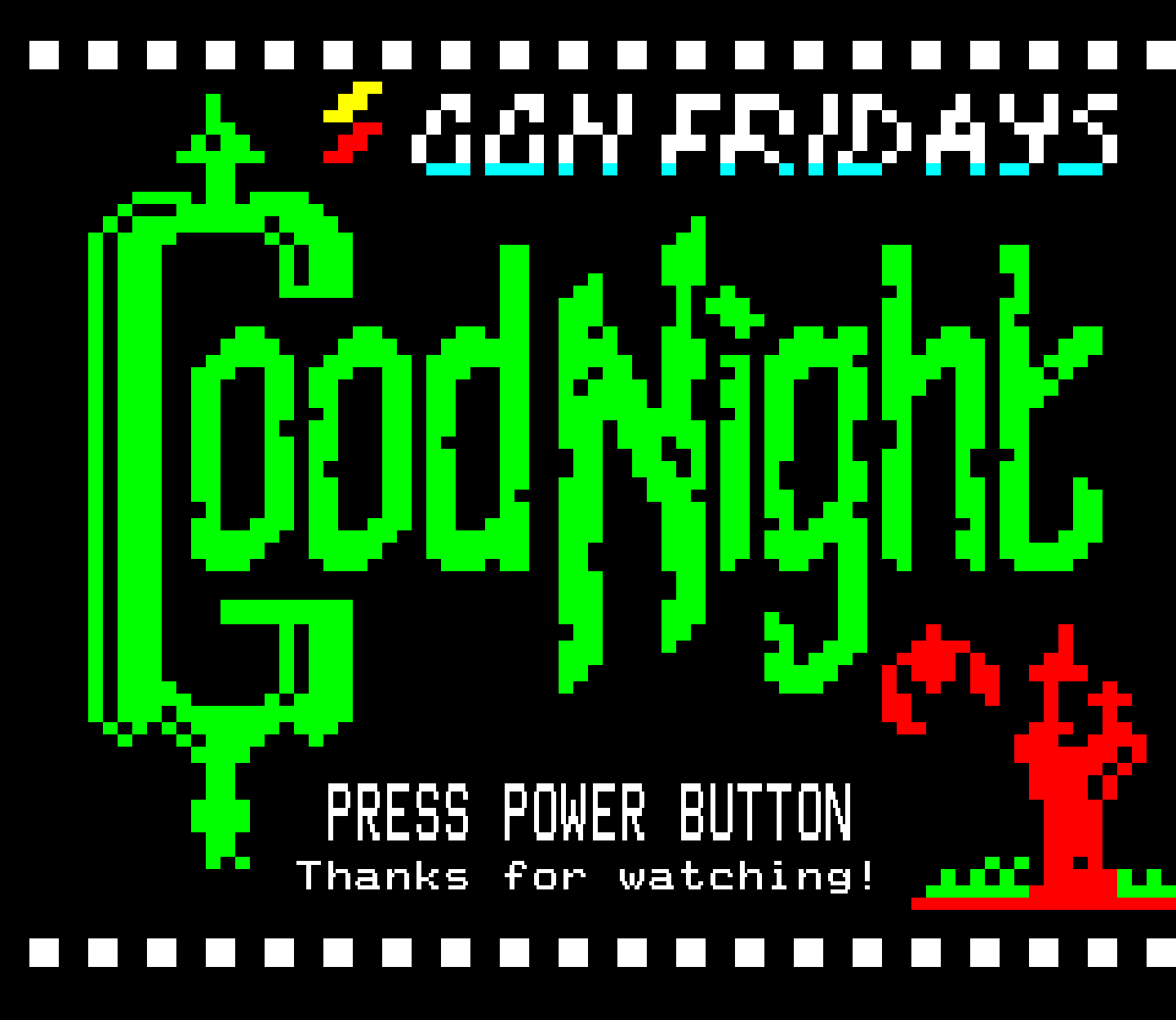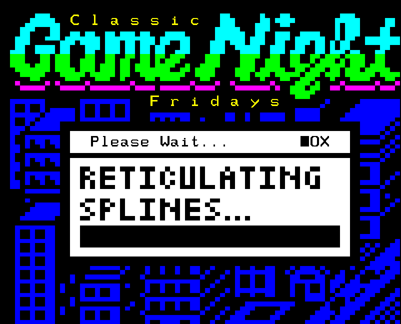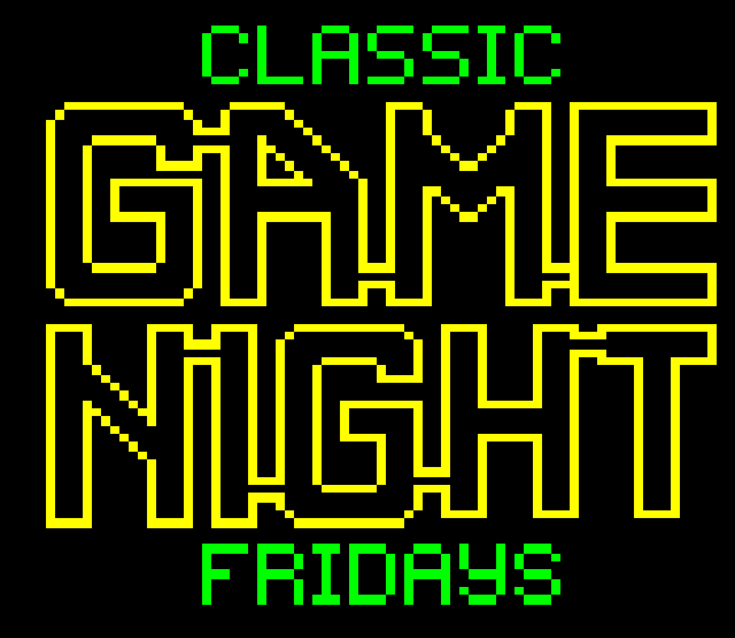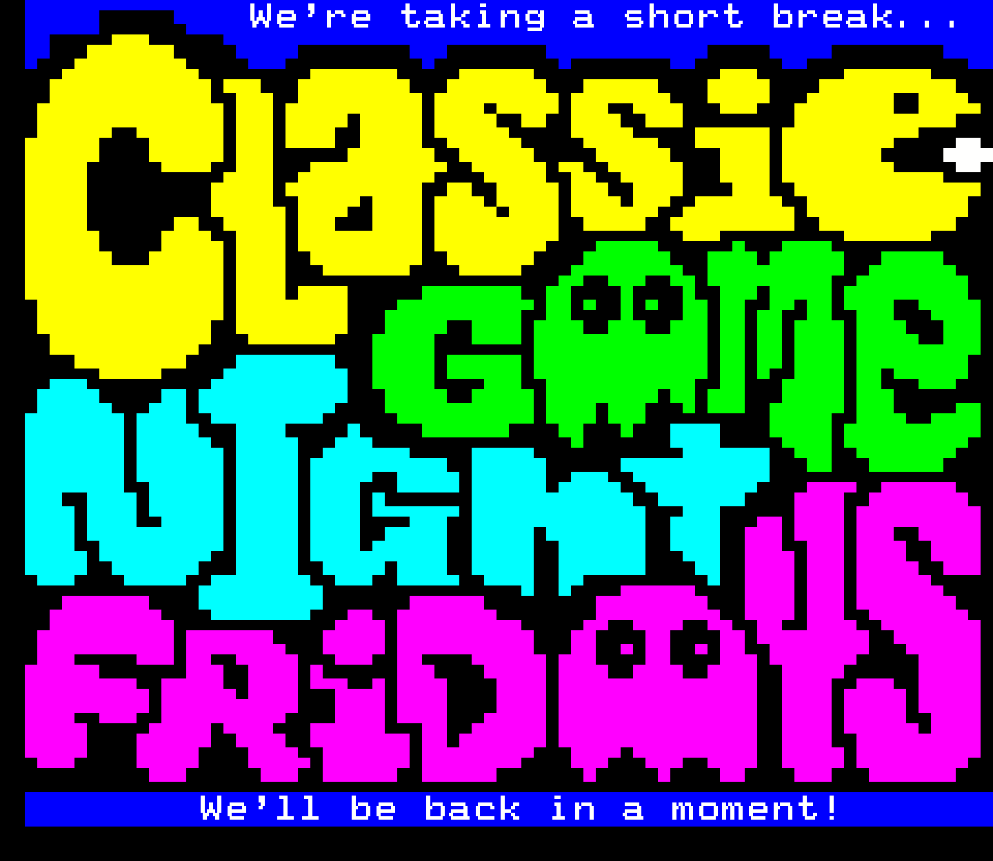 A variety of graphics for the Classic Game Night Live show, formerly Classic Game Night Fridays – mostly teletext with a few NES title screens thrown in for good measure.